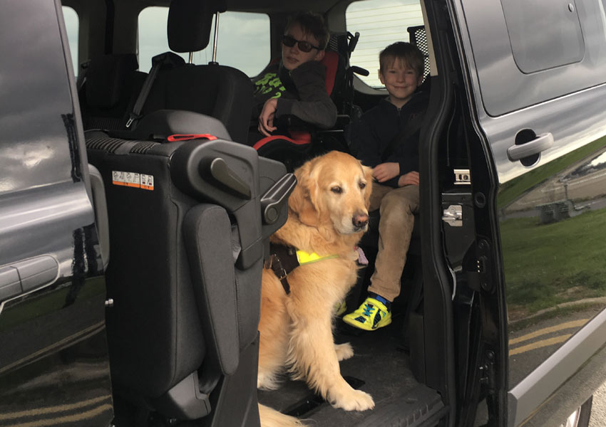So, here’s the problem. We have four children – three boys, aged 16, 15 and nine, and a young lady of 12. Eoghan (15) has recently graduated from a manual wheelchair to a very large power chair. In addition, he is accompanied everywhere by his assistance dog Duke, a 37kg adult male golden retriever. The problem is how to fit them all into a family car.