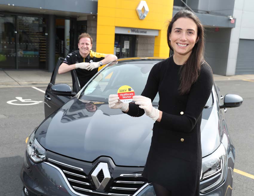 This joint initiative between Axa and Renault is to acknowledge the exceptional contribution being made by returning medics to support the national response to the pandemic. Sarah is photographed at a social- distance with Richard Murphy of Renault Belgard collecting her Renault Mégane.