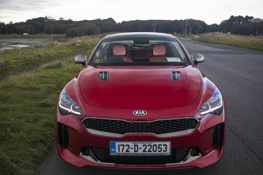 And on the road? The Kia Stinger will be available with two engine options in Ireland – a 3.3L V6 365bhp twin turbocharged lump that will do 0-100kmph in 4.9 seconds. There will also be a 2.2L turbocharged diesel engine (200bhp). Both come with an 8 speed auto gearbox and paddle shift option. We tested the 3.3L V6 version around the Kildare countryside on a slightly damp day. Behind the glorious grunt is a very tail happy Stinger that doesn’t want to be tamed. Acceleration is impressive and it feels extremely solid on the road – as long as you can keep that rear end under control!