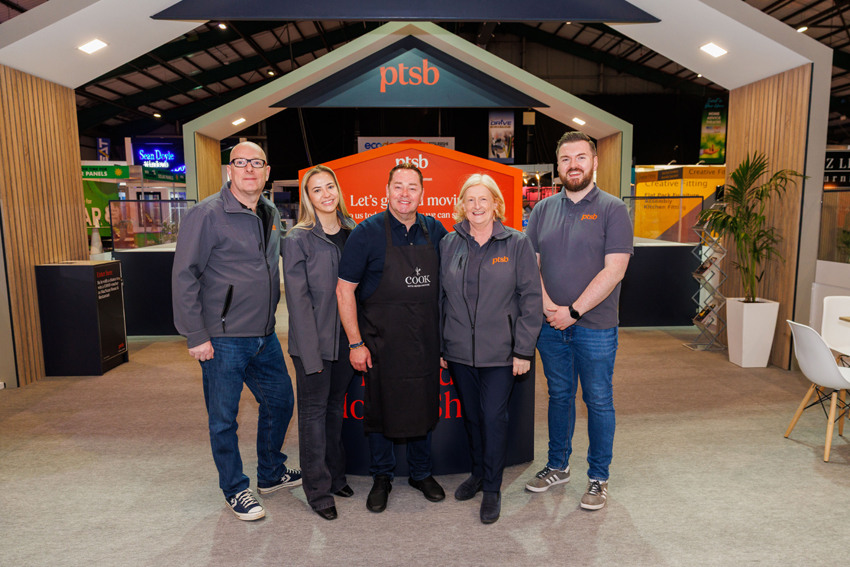(above) Chef Nevin Maguire with the PTSB team at the PTSB Ideal Home Show (Top) Jo Linehan, Hugh Wallace and David Flannery at the DFS Home Interiors Theatre.