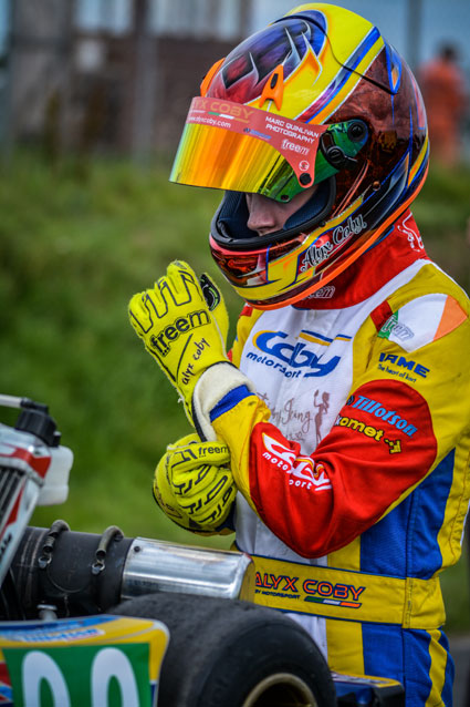 For the first of the day’s two finals Coby lined up in fourth position but dropped back one spot on the opening lap. Regaining fourth place two laps later, Coby was once again tasked with closing the gap opened up by the top three drivers. As she had done in the qualifying heats, Coby closed the gap lap by lap with a string of consistently fast laps. As the last lap board came out Coby had caught the lead pack and worked her way up into third place. By the time the karts exited the final corner the top three were side by side for another drag race to the chequered flag. Coby crossed the line in third place, just under two tenths of a second behind the race winner but he was awarded a five second time penalty for a dropped nose cone which then promoted her to second place.